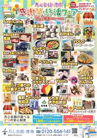 月心会館港南では感謝祭&終活フェアを開催! 終活セミナーや、葬儀備品等の展示など、見どころ満載でお届け。また人気のキッチンカーや提携店が17店舗出店!ぜひ参加してみよう。 詳細はHPをチェック!