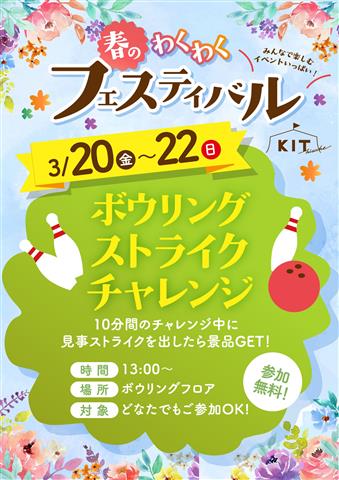 3月21日は愛媛プロレスが登場!クレープ販売やお菓子まきで盛り上がろう。22日は親子で楽しむ「ボウリング裏側探検」や豪華景品が狙える大ビンゴ大会を開催!連日開催のストライクチャレンジも無料で挑戦できる。