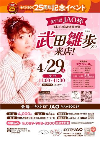 | 開催時間 | 12:00~16:00 JAO 麻雀大会 ゲスト:武田 雛歩プロ雀士(日本プロ麻雀連盟) 18歳以上の方が対象です。 応募は店頭またはオンライン予約にて受け付けます。 参加費:4,000円 |